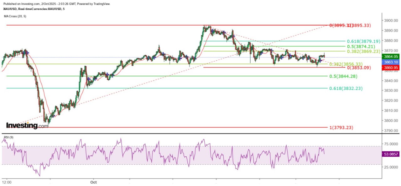 現貨金價在今早亞洲市早段低見3853美元後反彈,最高升至3865美元。從5分鐘圖觀察,金價昨天以來的累計調整幅度,約為9月30日以來最大升幅的38.2%(3856.33),我將其稱為強勢調整,即5分鐘圖的上升趨勢未遭到破壞,後市能否再創新高則是另一回事。若從小時圖觀察,金價仍低於20SMA(3870.75),故須重新守穩該線才有望進一步攀升。短線而言,隨著金價波動性加劇,且走勢偏弱,保守估計,3875至3880美元將成為金價日內主要阻力,且仍有可能調整過去兩日最大升幅之50%,即有機會測試3844.28美元支持。