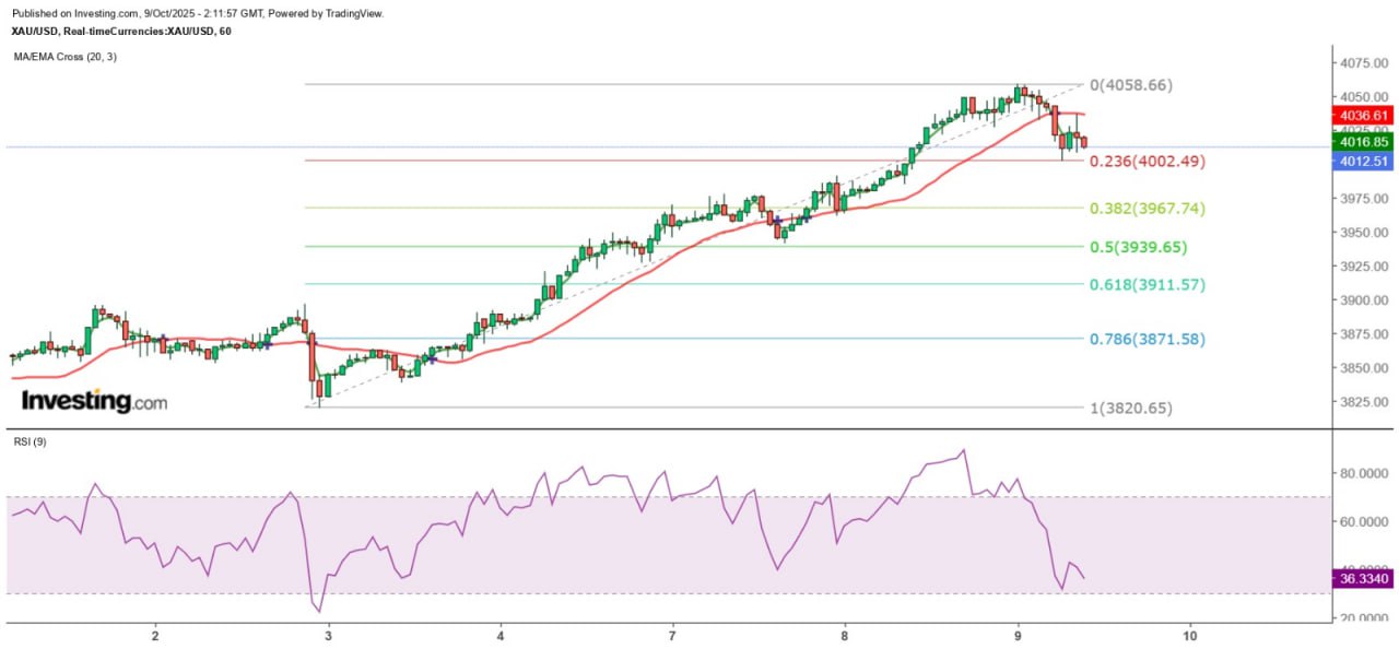 金銀價格在昨天紐約午市開始力弱,並雙雙從高位大幅回落,金價在今早亞洲市低見4001.75美元後再度攀升,早段曾高見4036.42美元。由此反映,4000美元已成為金價新的強支持位,其次就是金價目前處於江恩正方形4010至4060美元波動。不過,投資者亦須注意,金價在小時圖已連續5小時收低於20SMA(4037.45),是10月3日以來最長時間,該線視為短期反彈阻力。