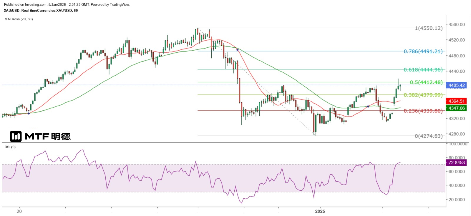 In the short term, the gold price will be constrained by the 4410-dollar resistance level of the Gann Square's 270-degree vertical angle next year. From the hourly chart, it can be seen that the spot gold price has been in a sideways pattern since it fell below 4400 dollars on December 29th. Although the high of 4220.2 dollars this morning slightly broke through the 50% retracement level of the biggest decline since last week at 4412.48 dollars, it failed to hold above that level. Therefore, 4410 and 4412.48 dollars are still regarded as important short-term resistance levels for now. The gold price hit a low of 4309.87 dollars last Friday, slightly below the 225-degree angle at 4310 dollars. Therefore, it is expected that the gold price will fluctuate between 4310 and 4410 dollars in the short term at most. However, the gold price closed almost with a bearish engulfing candle on December 29th, indicating that it has peaked at 4550 dollars. In the future, it is likely to test the 50-day moving average (4201) on the daily chart before a strong rebound is expected.