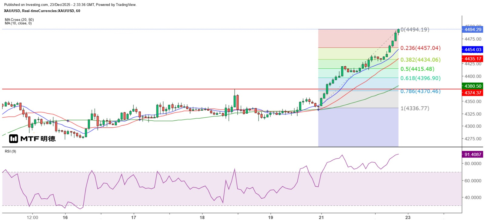 現貨金價已突破4410美元的江恩270度垂直角重要阻力,該位將成為回調的重要支持位。昨天曾提到金價在日線圖仍有大雙頂的風險,但金價破頂後,在一兩天內未出現雙日轉向的訊號,投資者將焦點集中在短期突破向上的走勢,此外,金價是否仍然9RSI呈雙頂背馳的情況,現時前頂對應的9RSI為89.87,目前9RSI則為88.93,即仍呈背馳,相反,如9RSI升破前值,則背馳消失,金價的回調只基於其超買情況。