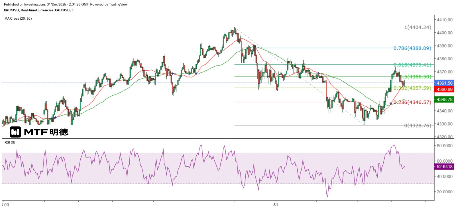 今天是2025年最後一個交易日,市況可以極之波動,亦可能極其沉悶。就金價的走勢而言,惟有突破上周五頂部才有機會延續升勢,投資者須注意,金價自上周五以來的走勢,與10月21日大跌後的走勢相似,故需提防在上周五的波幅下限整固後進一步下試低位,金價雖守在日線圖20SMA以上,但若持續緊貼該線,顯示其反彈力弱,急速向下突破該線的可能性較高。