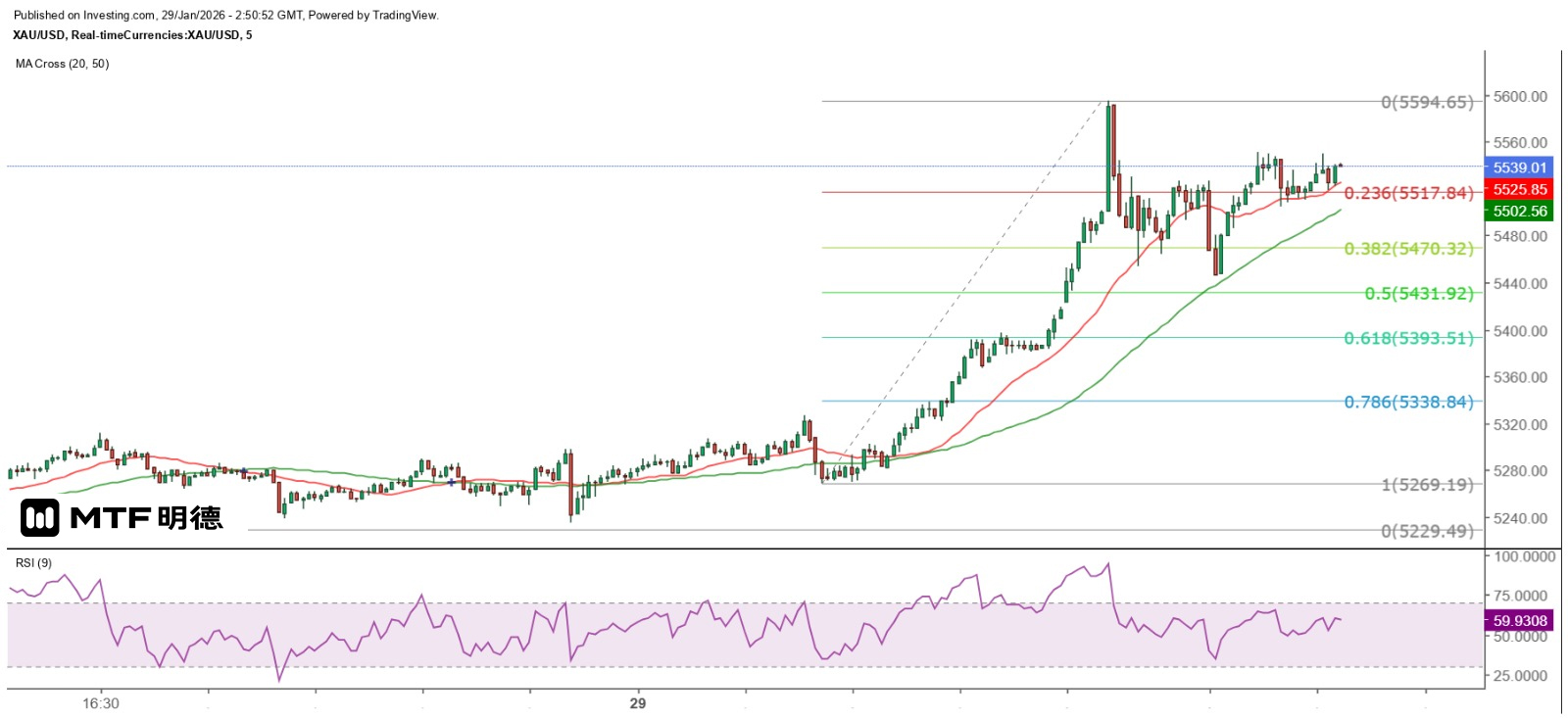 現時從技術角度看,只能從1分鐘或5分鐘圖表進行分析較實際,而20及50SMA仍然是主要的移動平均線支持。從5分鐘圖可見,今早金價的回調低位5446.64美元,仍然較50SMA高近10美元,換言之,現時的短線操作風險已大幅上升。現時5550美元為超短線阻力,從江恩正方形觀察,5560美元位於270度垂直角,故屬強阻力所在,下一級較具阻力的價位則為5710美元,支持位則為50SMA(現約5500),下一級較具支持的價位則為5410美元。