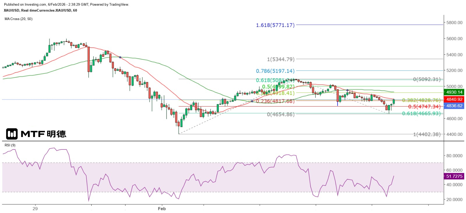 從小時圖觀察,金價昨天的調整低位,已略低於2月2日以來最大升幅之61.8%調整幅度,其後展開反彈浪,預示短期調檀很可能已經結束,如以波浪理論分析,金價很可能已完成2浪調整,以3浪幅度相當於1浪之1.618倍計,金價將可升至5771.17美元,若簡單以1比1的幅度計,金價亦可升至5344.79美元。