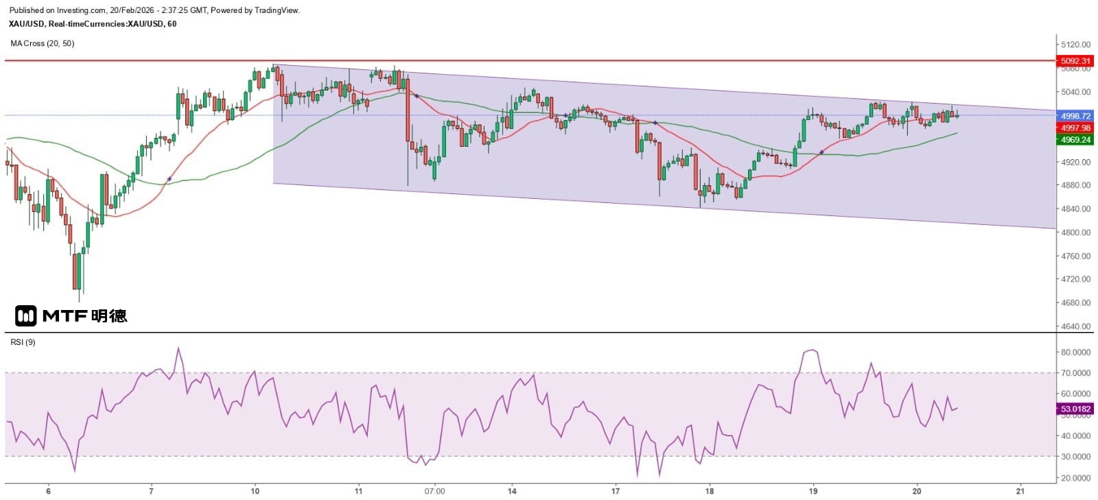 在過去三日的農年新年假期,金價大致維持區間波動,現貨金價雖曾三度升至5000美元以上,但卻未能收高於該位。從日線圖所見,金價在過去三日皆收低於20SMA(現約5007.33),是去年11月10日重上20SMA以來連續三日收低於該線,反映金價進一步大跌的風險增加。