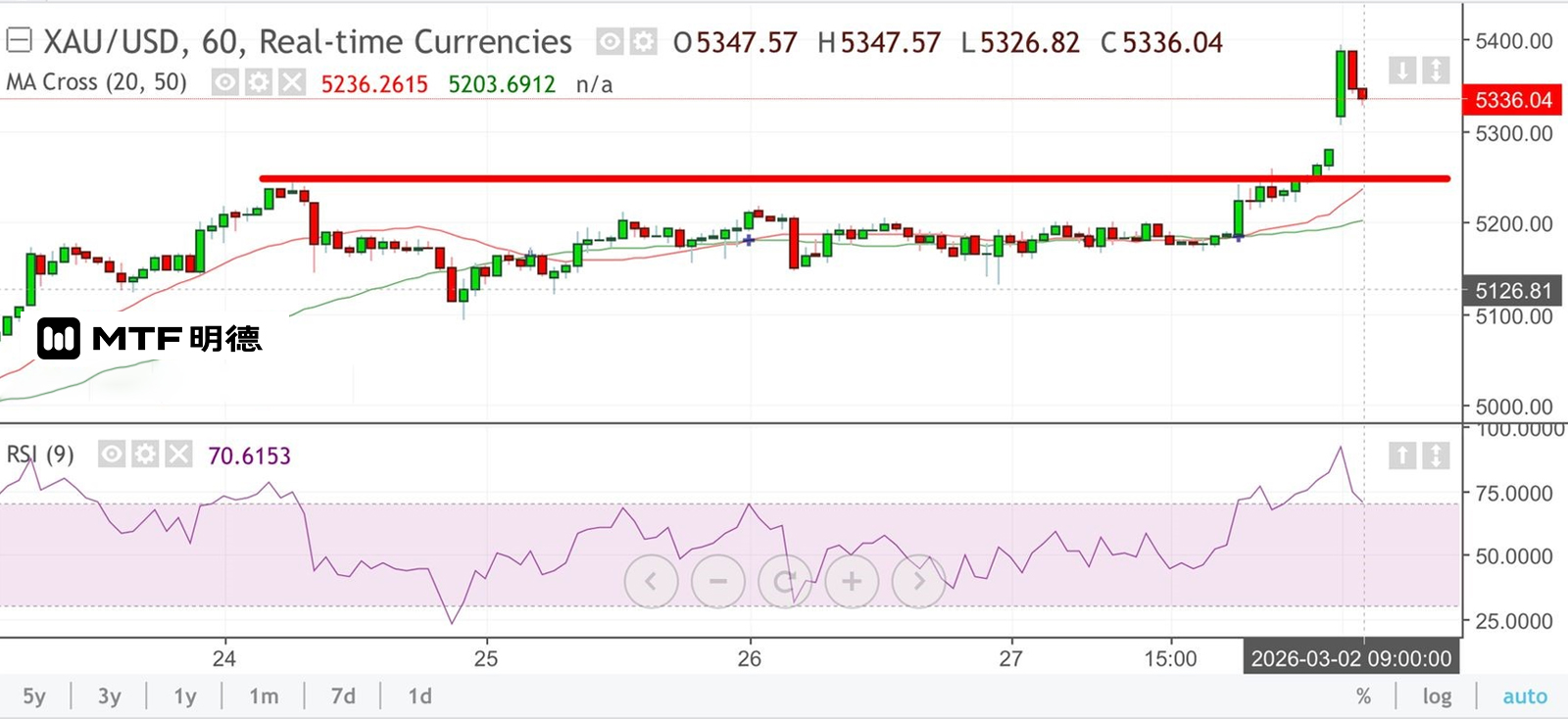 雖然特朗普表示,伊朗有意與美國進行談判,但他又預期美國對伊朗的軍事行動將會維持四周,故相信金融市場的避險情緒難以在短期內降溫。至於金價方面,5360位於江恩270度角,但金價曾逼近5400美元,在目前情況下,金價仍傾向反覆上試高位。