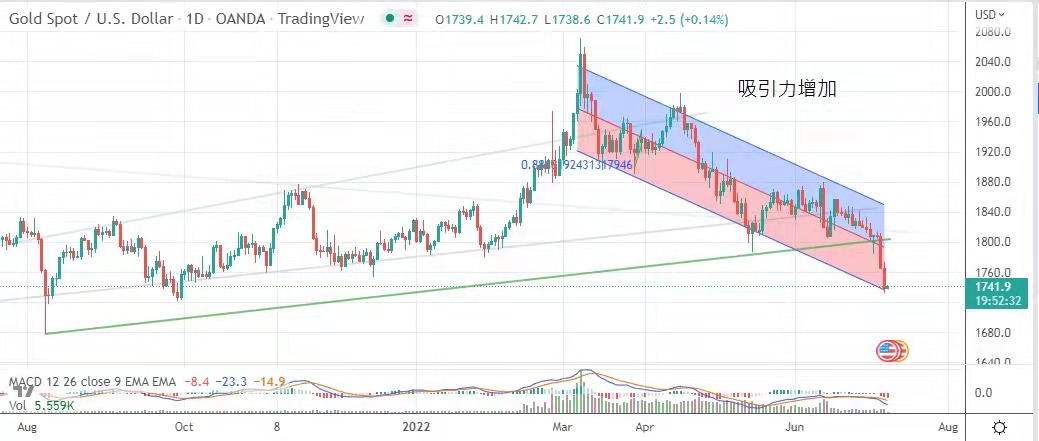 After seeing a high of $1,773 yesterday, it continued to fall, with the worst low of $1,732.2; After the Federal Reserve announced the minutes of the June meeting, the market bet on the Fed's interest rate hike.