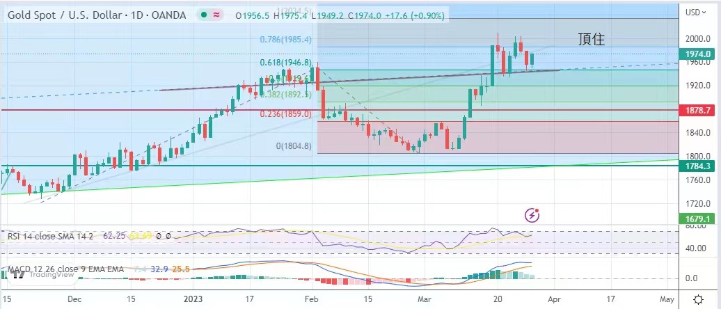 The investors expected that the interest rate hike cycle would be shortened, and the gold market rebounded. The lowest price of gold was $1,949.2, and the highest price rose to $1,975.4, closing at $1,974, up.