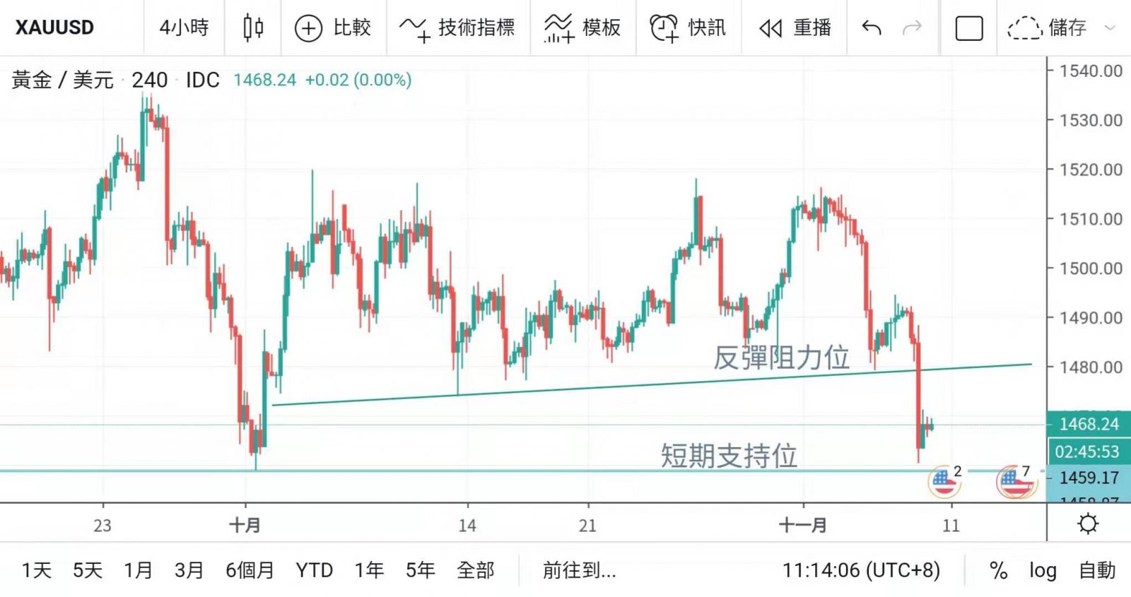 由於本周跌勢過多,在周結前會有反彈修正需求, 加上1460關口為9月中的低位支持,此水平會吸引部份吸盤進場,支持了金價短暫靠穩;