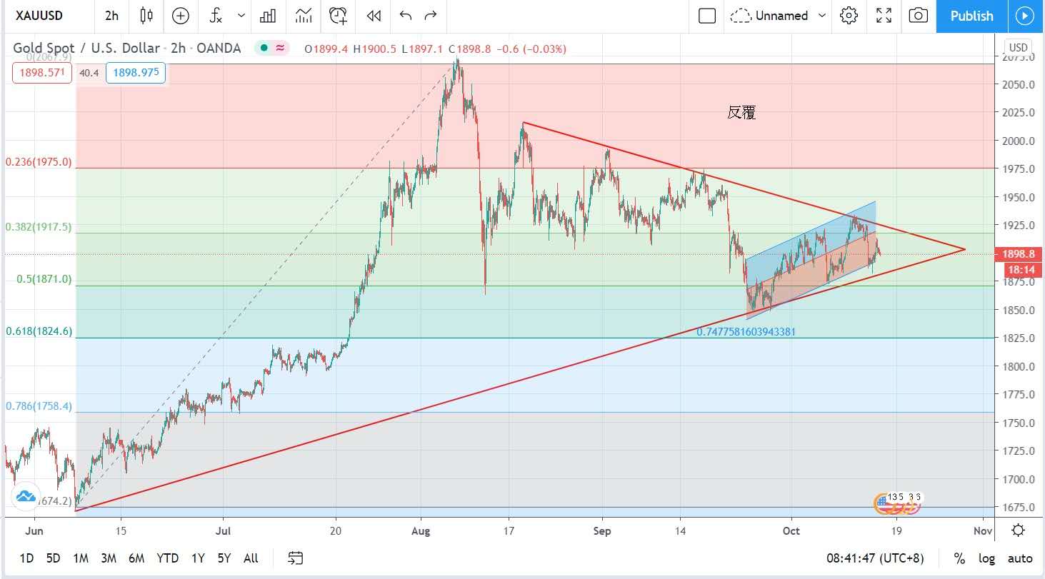 The final price was $1902 per ounce, up $10. The price of gold has not yet fallen below the rising trend line, and has a convergence triangle with the falling line, so it is seeking a breakthrough opportunity.