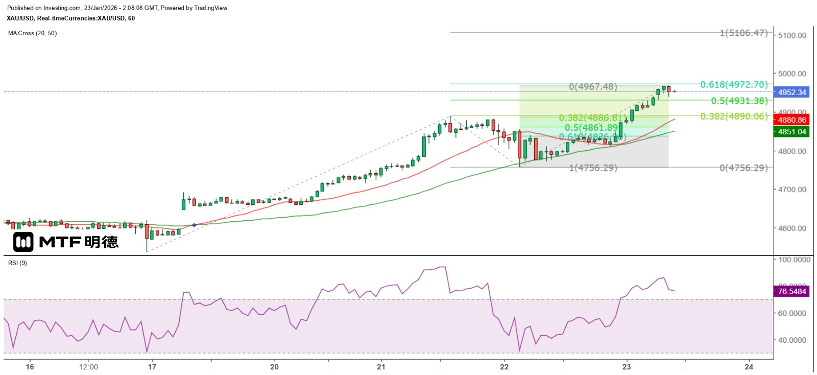 From the hourly chart, using the Fibonacci extension lines to measure the movement since January 16th, the high price of gold this morning has approached the 61.8% extension level at $4,972.7. Of course, this does not mean that the price of gold will definitely not rise further. Such calculations need to be made in advance by investors and used as part of their strategy to turn into profits. If the price of gold can break through the top and reach a new high, the next major resistance level is at the 135-degree angle at $5,110. If the price of gold reaches the 100% Fibonacci extension level, it could rise to $5,106.47. Therefore, it can be expected that the price of gold will encounter significant resistance above $5,100.