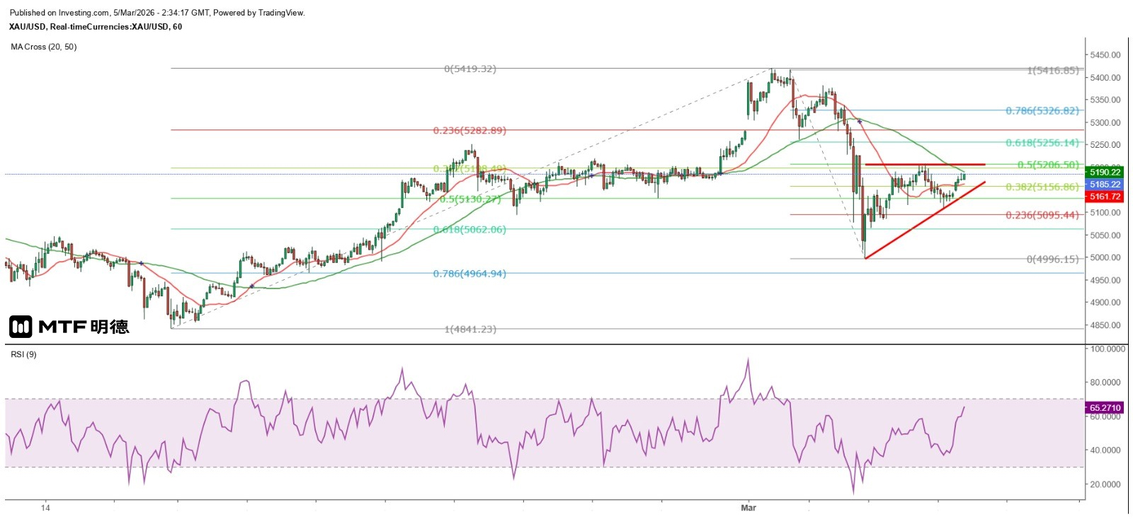 Yesterday, the gold price's low in New York City was very close to the 135-degree angle of Gann Square at $5,110, so it is expected that the gold price's fluctuation range will start to narrow upwards, and $5,110 will become an important short-term support level. From the hourly chart, the gold price is gradually forming a narrowing triangle. The daily high of $5,205.91 in New York City yesterday was very close to the median of the fluctuation range since March 2nd at $5,206.5. The gold price was again blocked at this level, reflecting that the bulls lack the confidence to break through this level.