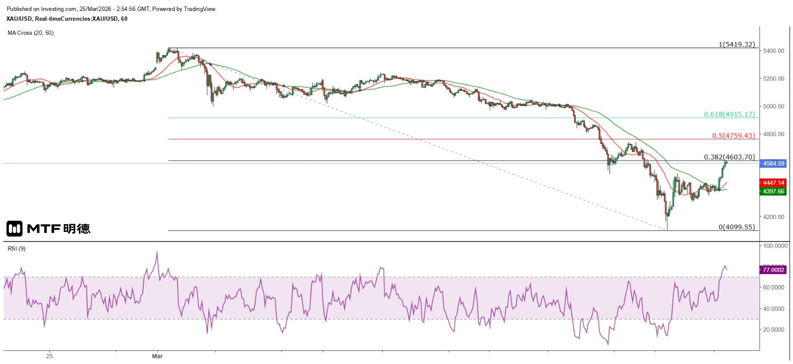 Gold prices have continued to rebound. After forming a triangle on the hourly chart, spot gold prices broke upward through the 50SMA (currently around 4397) in the late New York trading session yesterday. This morning, it rose to 4601.08 US dollars, just over a hundred dollars away from the 4720.17 US dollars indicated by the 100% Fibonacci extension level mentioned yesterday. Additionally, gold prices have also surpassed the previous low of 4503.47 US dollars set on March 19th, thus breaking the downward trend on the hourly chart.