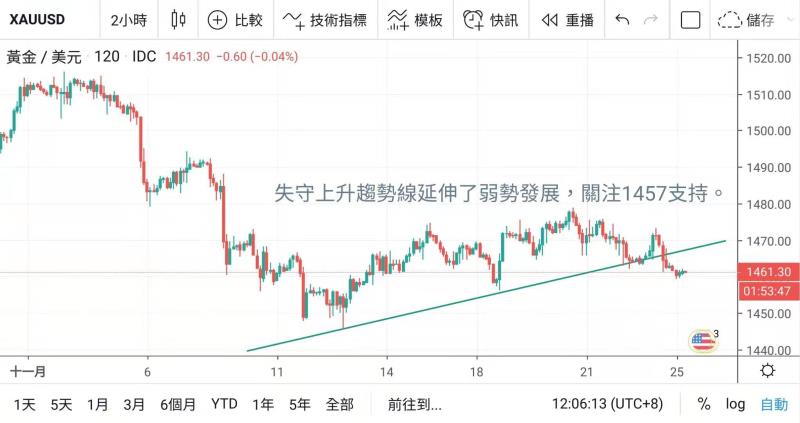 金價在週初時間曾見靠穩反彈,但同樣於1480關口前,未能突破,週中後與歐幣同步下挫,金價於週五無法再企穩於1470上方,輾轉下挫至1460邊緣,今晨仍見金價貼近於1460關口徘徊,創近半個月低位。
