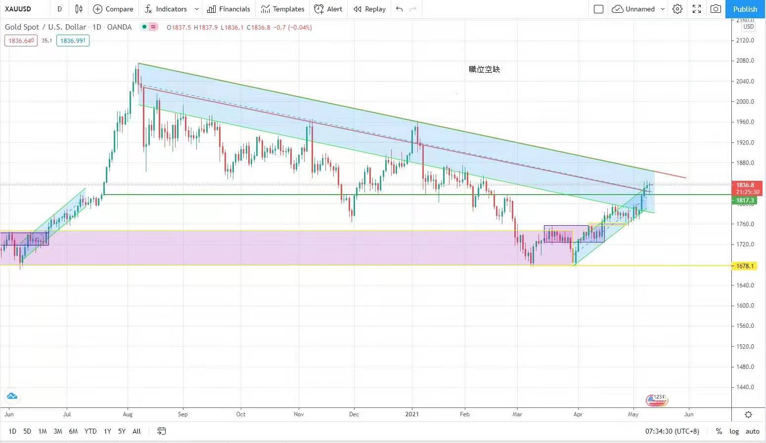However, officials of the Federal Reserve Bureau are still saying that inflation is caused by short-term overshooting, and there should be no short-term interest rate increase. The gold price can still be seen as higher, and the target of $1,848 in the next stop remains unchanged. Today's proposed amplitude is between 1825 and 1843.