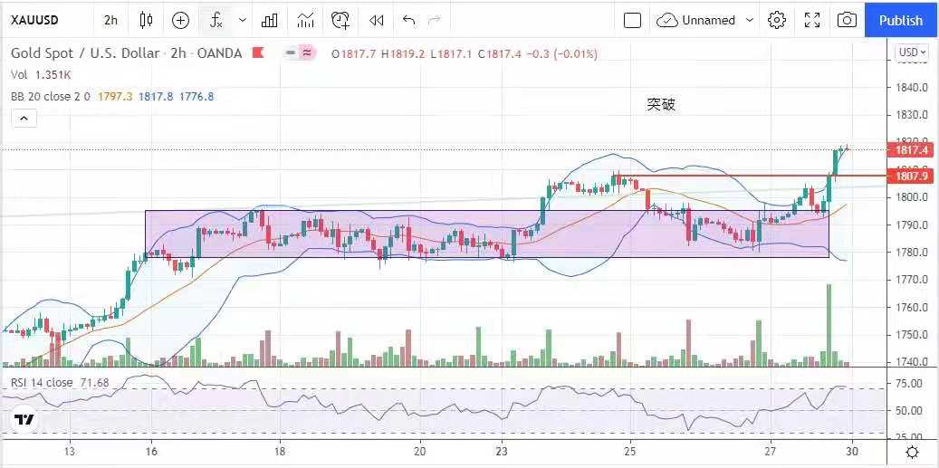 The move of the bond purchase plan is not equal to the signal that the interest rate increase is coming. The market understands that Powell used to play the role of a pigeon as an eagle, and the gold price regained its upward trend, finally closing at $1817, rising by $25, and rising by $37 in a week.