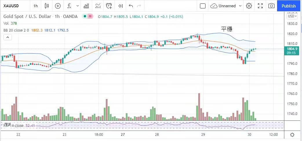 The price of gold once fell below 1,800 US dollars, with the lowest price of 1,789.5 US dollars, compared with yesterday's high of 1,807.8 US dollars, with an amplitude close to 18 US dollars. However, the property market data was far less than expected, and the price of gold made a V-shaped rebound, and finally closed at 1,804.1, down 2 US dollars.