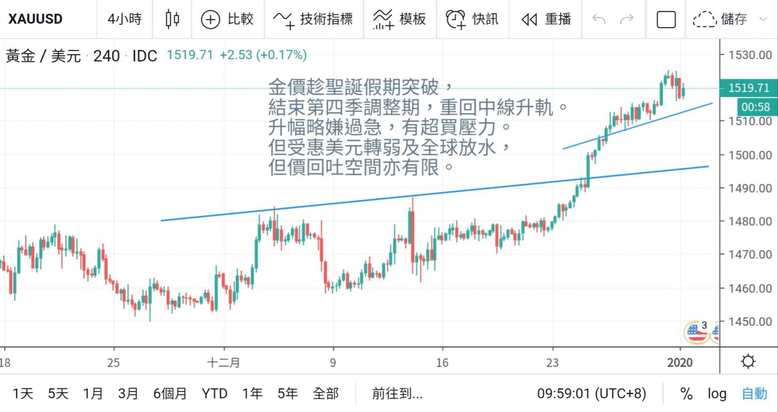 回顧2019表現,金市升幅遠遠拋離匯市,由1280水平左右起步,上週收市1518計算,升幅達18%,