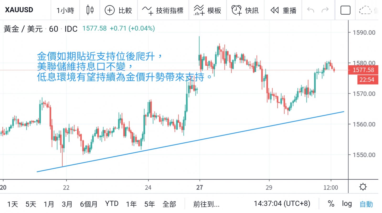 金價因此晚上得到爬升動力,於深夜時份再衝擊1580關口。延至今晨,金價仍然靠穩於1570上方,