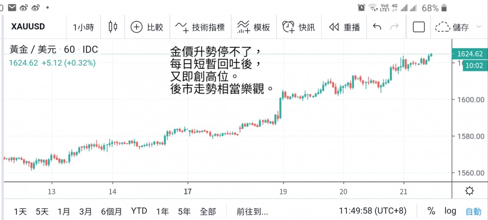 这两晚见金价高位定必作出适当回吐,但又马上收市前继续冲高,而且续有买盘承托走势,投资者可继续进三步,退一步形式,
