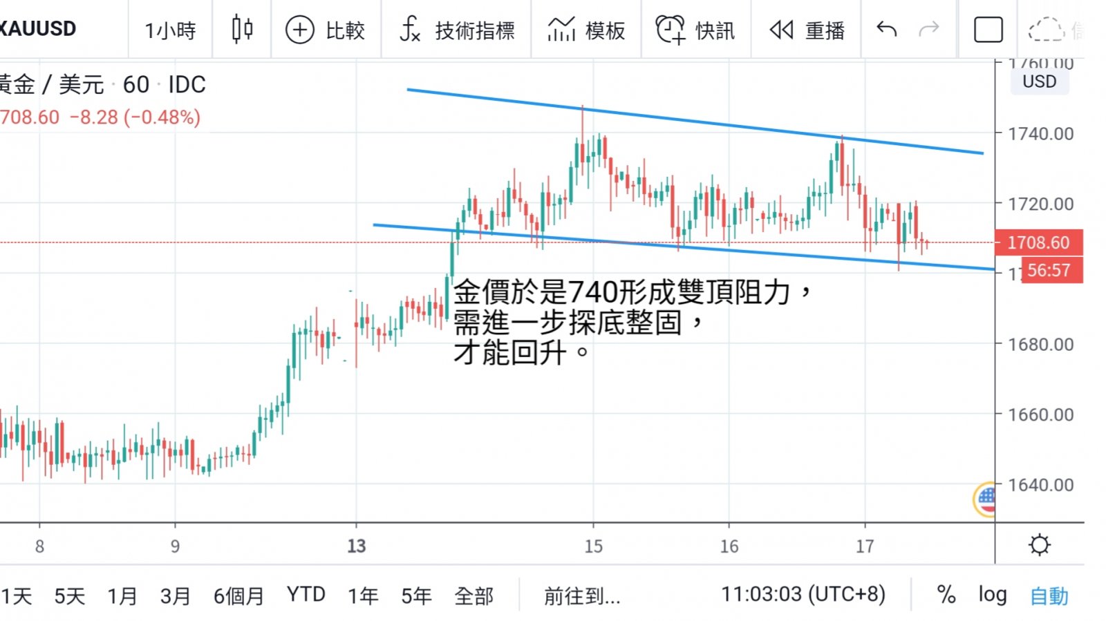 技术上,金价高位1740形成了双顶压力,有机会再进一步测试低位,回试1700心理关口,