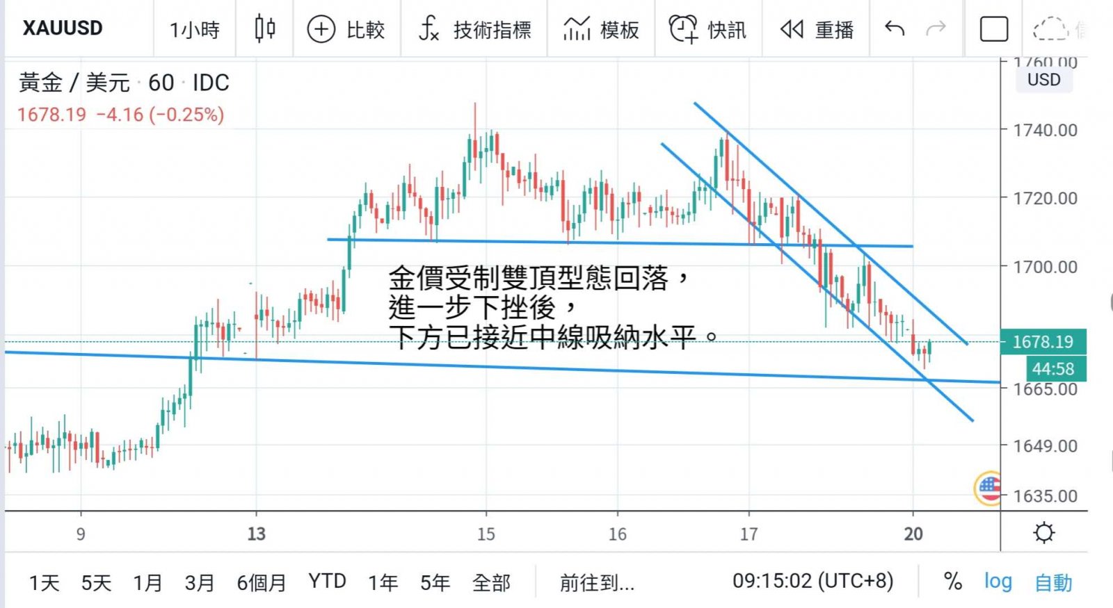 金价亦一如上星期预期,在突破1683后即升破1700,更在4月15日逼近至1750位置,可惜升势过急而获利者众,在周四形成双顶并跌穿本月上升通道底线1716后重返1685水平,