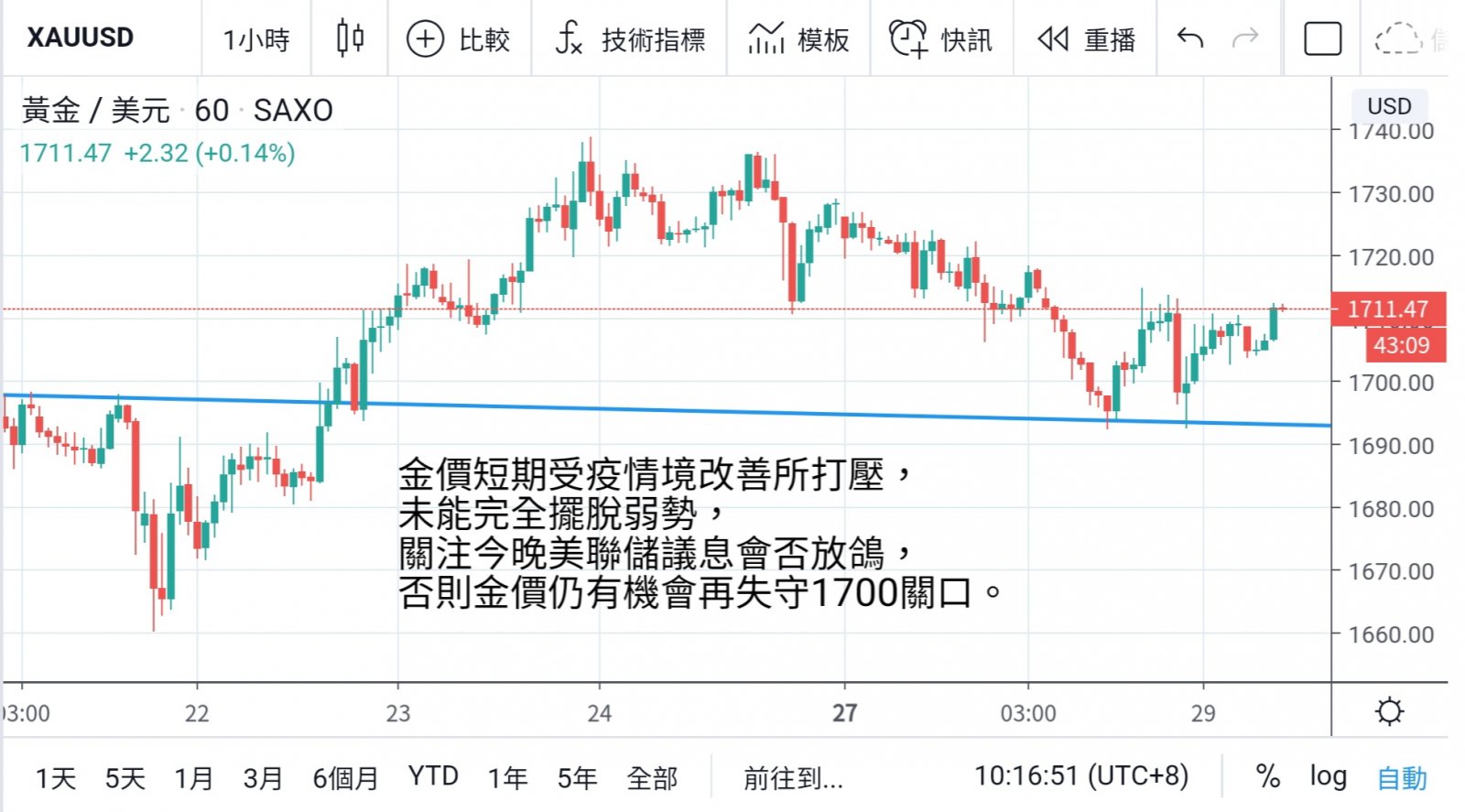 金价如期回吐,但低位亦见获买盘支持反弹,金价晚市企稳于1700上方,市场风险胃纳上升,打压了金价的上升步伐。