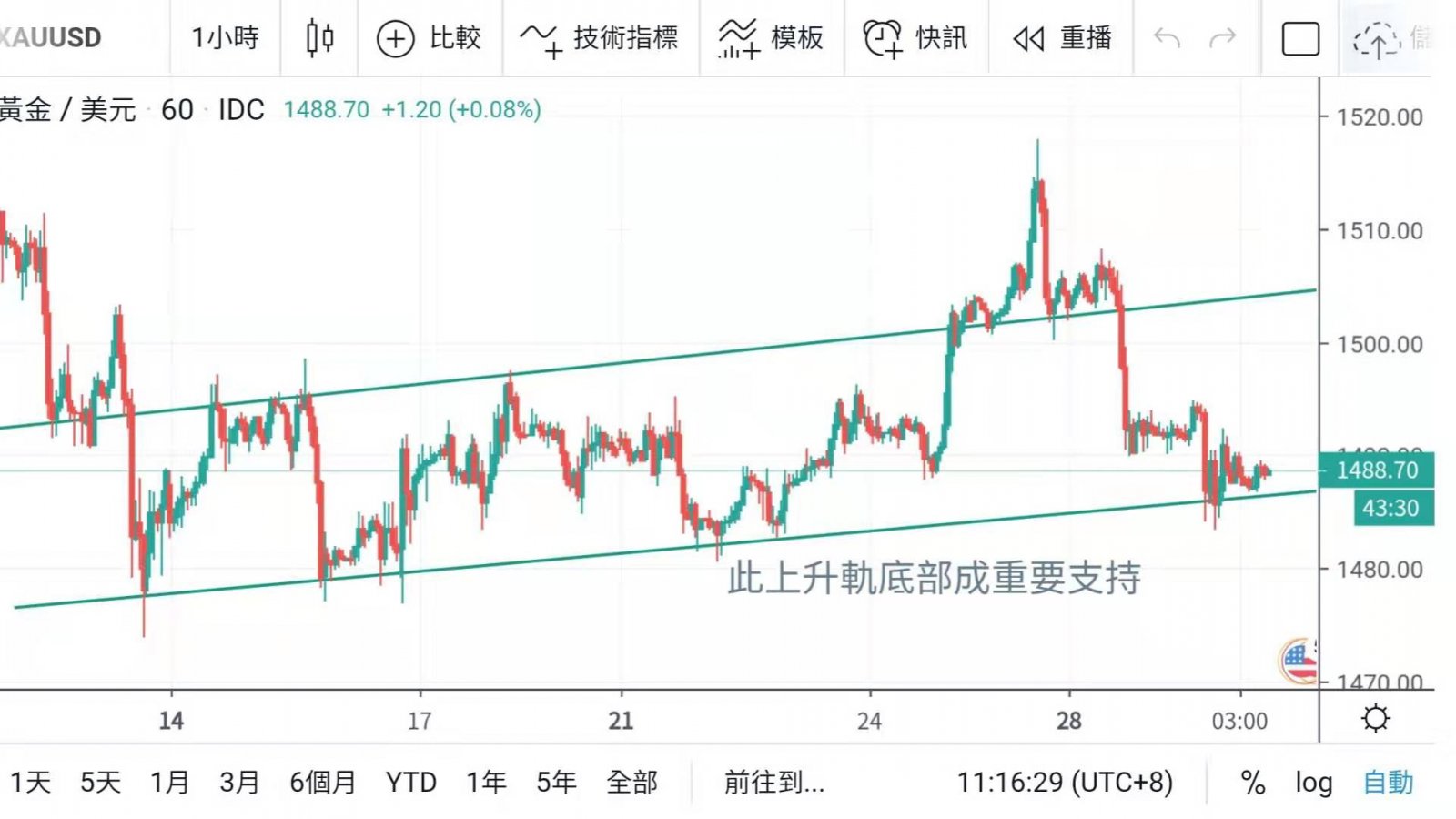 金价早段时间于1490附近徘徊,仍欠缺反弹动力,达入欧洲市中段,金价进一步调整,