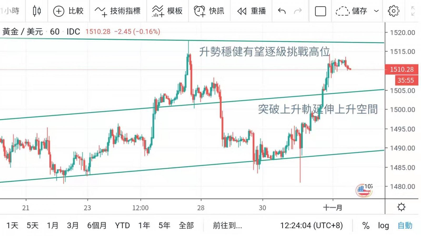 金价升势出现突破,升穿整固上升轨后,延伸升幅目标至1520关口,但升势今晚会先面临考验;