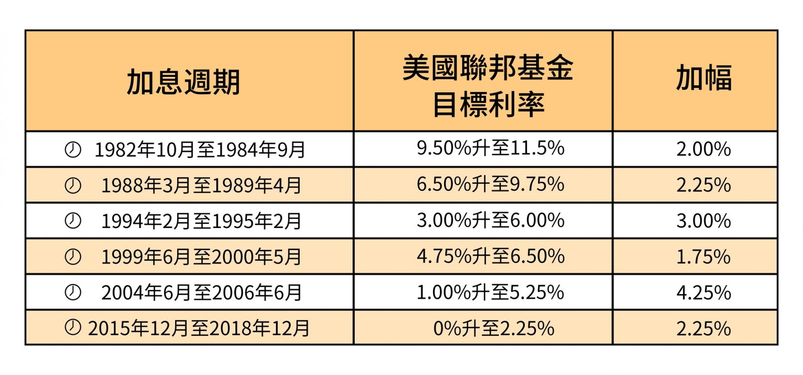 美国自80年代起经历过六次加息周期。主要应对均是经济过热情况,当中包括压抑物价飊升、互联网泡沫及房地产泡沫。大部