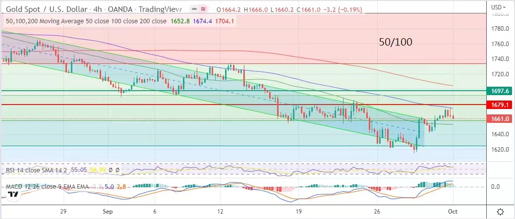 市场预期美国加息周期将在2024年才会降息,通胀不能单靠央行政策去解决,供应链才是关键,但短期内难以解决。美国联储局表明有留意各国央行干预汇,令美国资产价格出现了一些波动,表示美联储关注全球经济,但仍会将政策重点放在美国本土上暗示会守在加息路上的极端领头大哥。美联储的态度仍将影响美元及其国债孳息率,对金市多头较不利,但非美元国家的干预,亦将使美元汇价难以一枝独秀。预期金价将继续来回震荡才能走出新方向。另外本周有非农数据出炉,定必为市场带来更大波动。今日以4小时图的50100周线作上下波幅建议,即1653美元至1674美元。