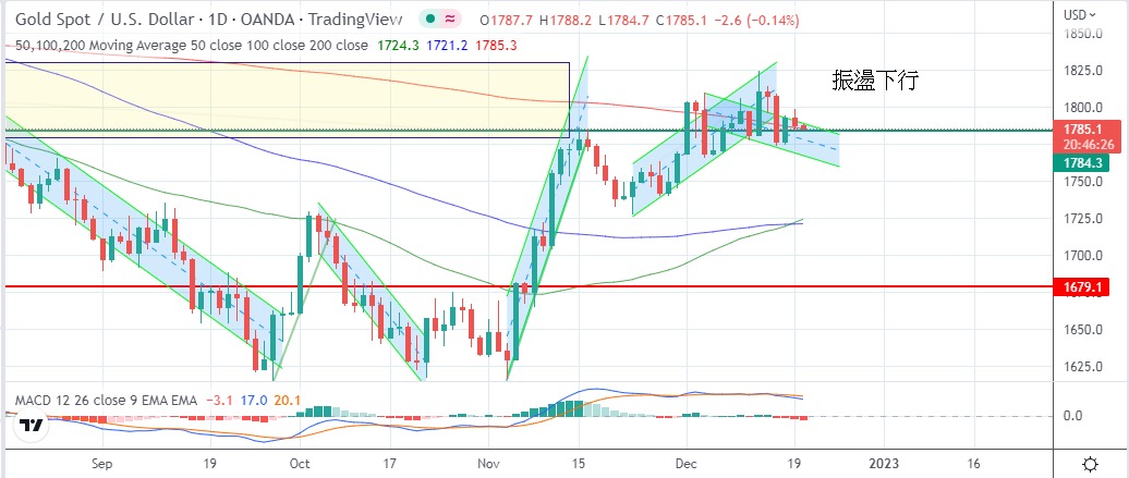 美联储在上周议息,虽然放缓加息至0.5%,但从点阵图中显示,美联储官员可能需要将指标利率调高至本周稍早预测的5.1%之上,并将有更长的加息周期的政策,美元指数受惠于加息预期,继续在104点上盘旋,金价受压,金价在最高见1798.8美元,最低见1783.9美元,以1787.8美元收市,跌5.4美元。