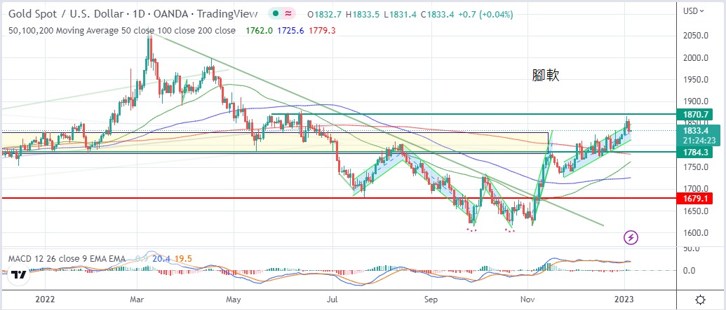 金市早日创半年以来高位受打压,昨日再被踩多脚,跌穿1840美元收市。金市亚洲时段已开始下跌,至美国公布上月小非农数据及上周首次申领失业金人数皆显示劳工市场紧张,触发市场对美联储在二月再次行执行陡峭加息政策,美元指数重上105点水平,金价最低见1825.1,最高造1859美元,以1832.7美元收市,跌22美元。