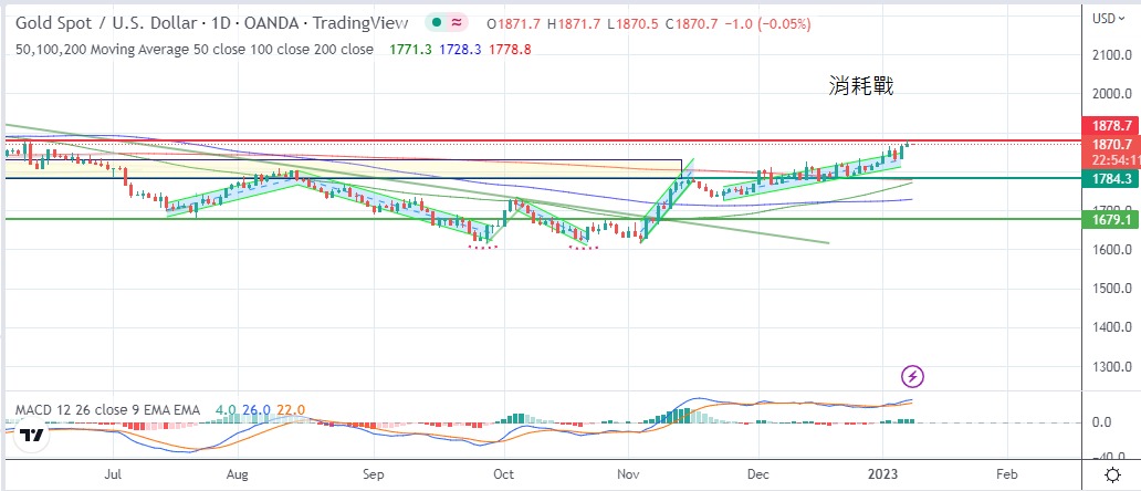 价冲击1900美元只是时间性问题,但留意金价短期在1880仍存压,可能打一阵消耗战,要小小耐性。今日保留昨