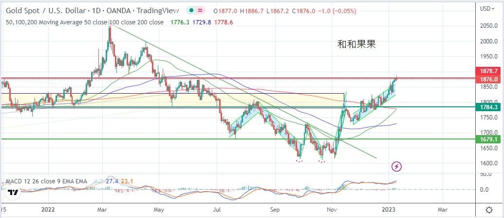 1886.7美元,但美股开市上升,打击了金价的涨势,金价在美市时段开始下调,最低见1867.2美元,最终以1876美元