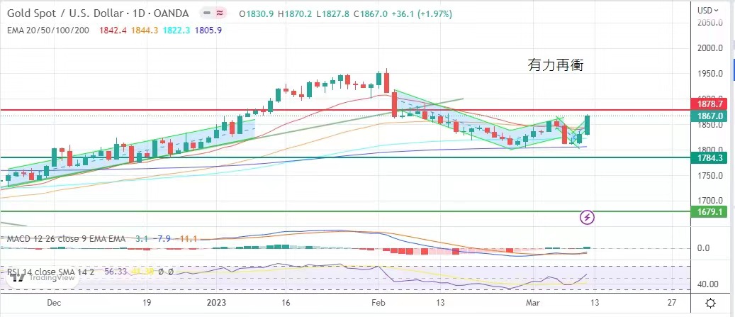 缓,市场预期加息在三月加息50点子的机率回软至低于五成,再加上美国矽谷银行爆雷,避险情绪紧张推动金价,