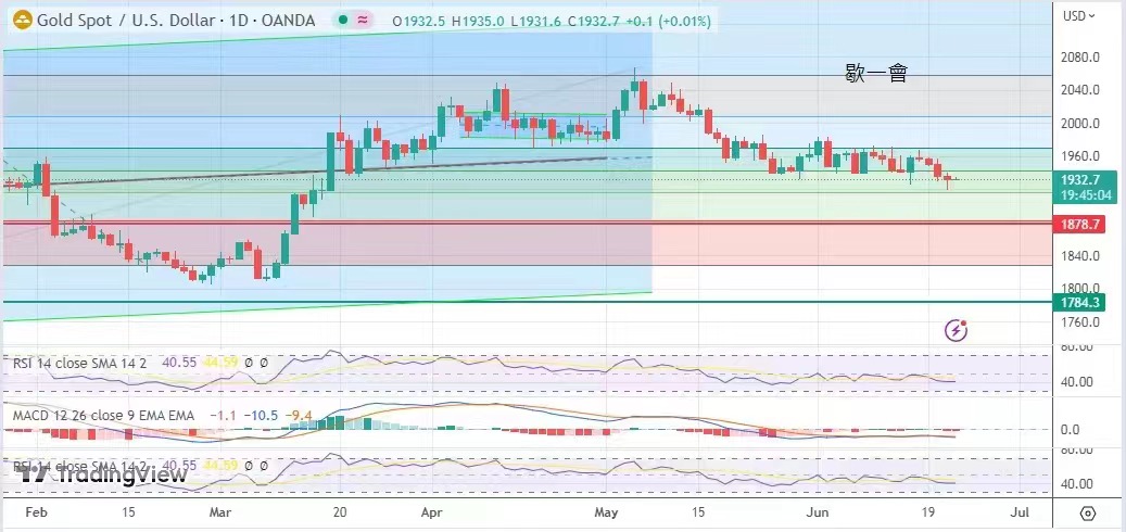 市场关注美国联储局主席鲍威尔在国会的讲话,市场预期联他的言语会较倾向鹰派,金市早段受压,最低曾见1919.2美元,之后他的在众议院金融服务委员会作证时表示,联储局委员们预估利率需要上调,但速度会更缓和,并一切以数据为依归。他的保守答法令市场稍为撤去忧虑,金价跌幅收窄,金价最高见1939.6美元,终收于1932.5美元,跌3.8美元。