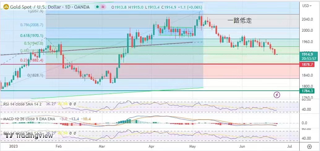 市场继续关注美国联储局主席鲍威尔在国会的讲话,周四,他明确地向市场发放鹰派言词,局方虽然尽量避免出现过度加息的情况,但今年再有两次加息仍是适宜的!金市受压,加上英国央行出乎意料地加息50点子,但市场担忧英伦银行进取的加息行为将引发英国经济衰退的可能,英镑兑美元反跌收场;金价跌穿1920美元,金价最高见1935美元,最低曾见1912.5美元,最终收于1913.8美元,跌18.7美元。
