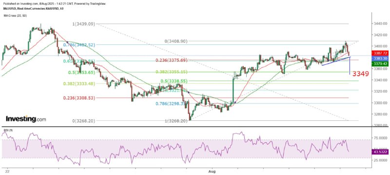 现货金价在今天亚洲市早段冲高至3408.9美元后迅速回落,并一度重返3385美元以下。从小时图所见,自8月1日以大阳烛向上突破后,金价仍维持上升趋势,惟要留意,如在小时图跌穿上升轨支持(现约为3380),则下跌目标指向3349美元,目前50日SMA略低于3350美元,故料该线将成为金价短期调整的重要支持位。不过,这是较悲观的看法,我估计金价日内倾向维持在昨天的波幅区间上落,即仍将守稳3365美元,并于下周一发动攻势,挑战3450美元才展开较大幅度的调整。