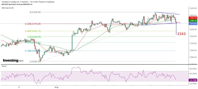 虽然我在上周五预期金价整固后,今天将会冲顶后再行大幅调整,但重点是反映金价今天短线触顶,而现货金价在今早亚洲市持续下跌,并在小时图跌穿TD上升轨,量度下跌目标约为3343美元,视为首个支持位,如调整7月31日以来最大升幅之50%则见3338.55美元,视为日内重要支持位,届时3372美元则成为短期反弹阻力。由于今早金价走势明显向下发展,日内再次突破3400美元几乎不可能,有力反弹至3390美元已是极限。