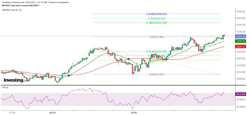 从江恩正方形观察,目前金价处于4210至4260美元区域,由于4210美元属于强支持(或强阻力),假设金价已守稳4210美元,则后市甚或日内很大可能将会挑战4260美元。从5分钟图可见,金价刚完成了一个费波纳奇100%扩展走势,但回调至20SMA后同样见支持并重拾升势,故仍有可能进一步达到1.382、1.5或1.618倍才回调,短线须注意金价升至4233美元,或突破该位后可能形成的双顶背驰,暂时4222.9美元可视成颈线,一旦失守量度下跌目标为4212.67美元,即接近4210美元的重要支持,届时金价或再次展开升势。