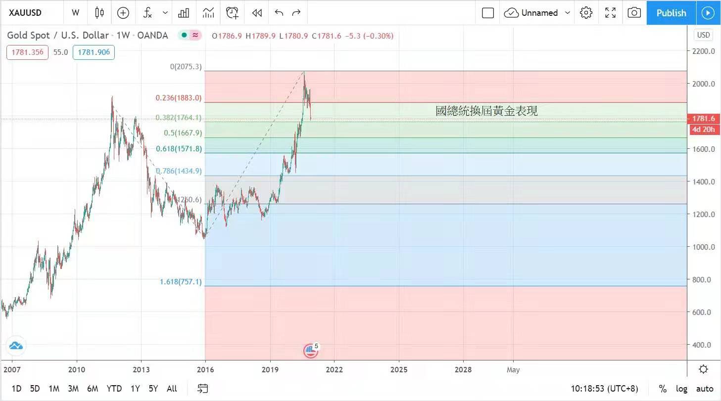 接二连三的疫苗消息传出,大选结果逐渐明朗,加上外围股市做好,视为传统投资工具的黄金继续受压,金价上周再向下调整,最低见每盎司1778美元,最终以每盎司1787美元报收,