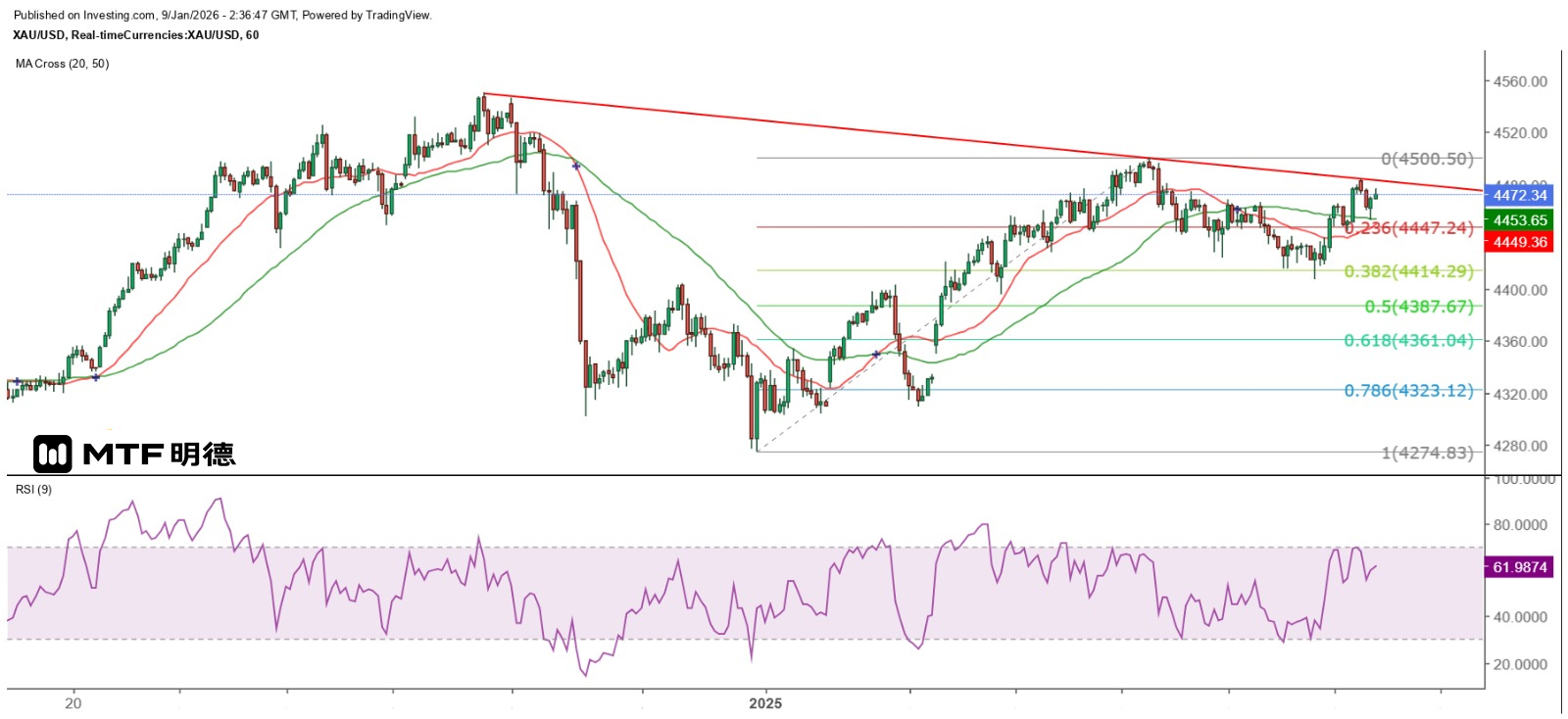 今晚美国劳工部公布12月非农就业报告,若非农就业人口变动与预期相符或略胜之,金价又凭甚么理由抽升?今早现货金高见4484.46美元后略为回调,从小时图观察,走势虽持续上升,但迫近前高4500.5美元明显遇到阻力,若可重上4500美元并守稳该位,则挑战4550美元的可能性增加,但创新高的机会则不大。当然,另一个考虑是,近期美国引发的地绿政治风险上升,但金价依然沉得住,是否等待非农这最后一根稻草才发动总攻击?然而,不论如何,价格反映一切,不用猜测,我估计在非农就业报告出炉前,金价倾向在4500美元以下波动,而4410美元仍然是强力支持位。