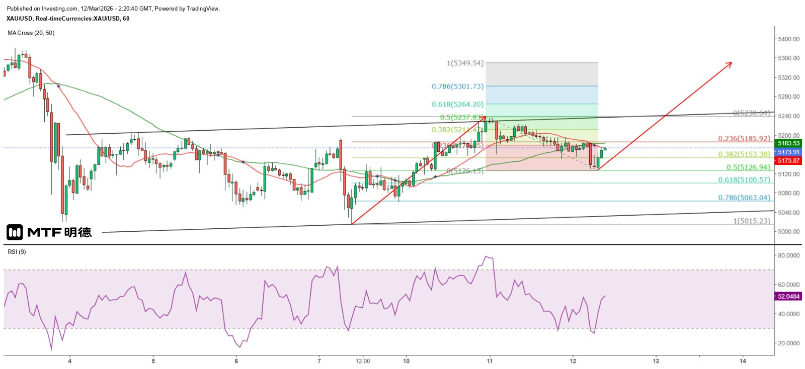 金价维持反复波动格局,从小时图观察,现货金价自3月3日以来逐渐呈现平衡上升通道形态,范围大约介乎5030至5235美元,即处于江恩正方形两大支持或阻力位之间—4960至5260美元。现货金价在今天亚洲开市初段急跌,最低跌至5126.13美元,其后反弹惟暂时受制小时图20SMA(5173.6)。
