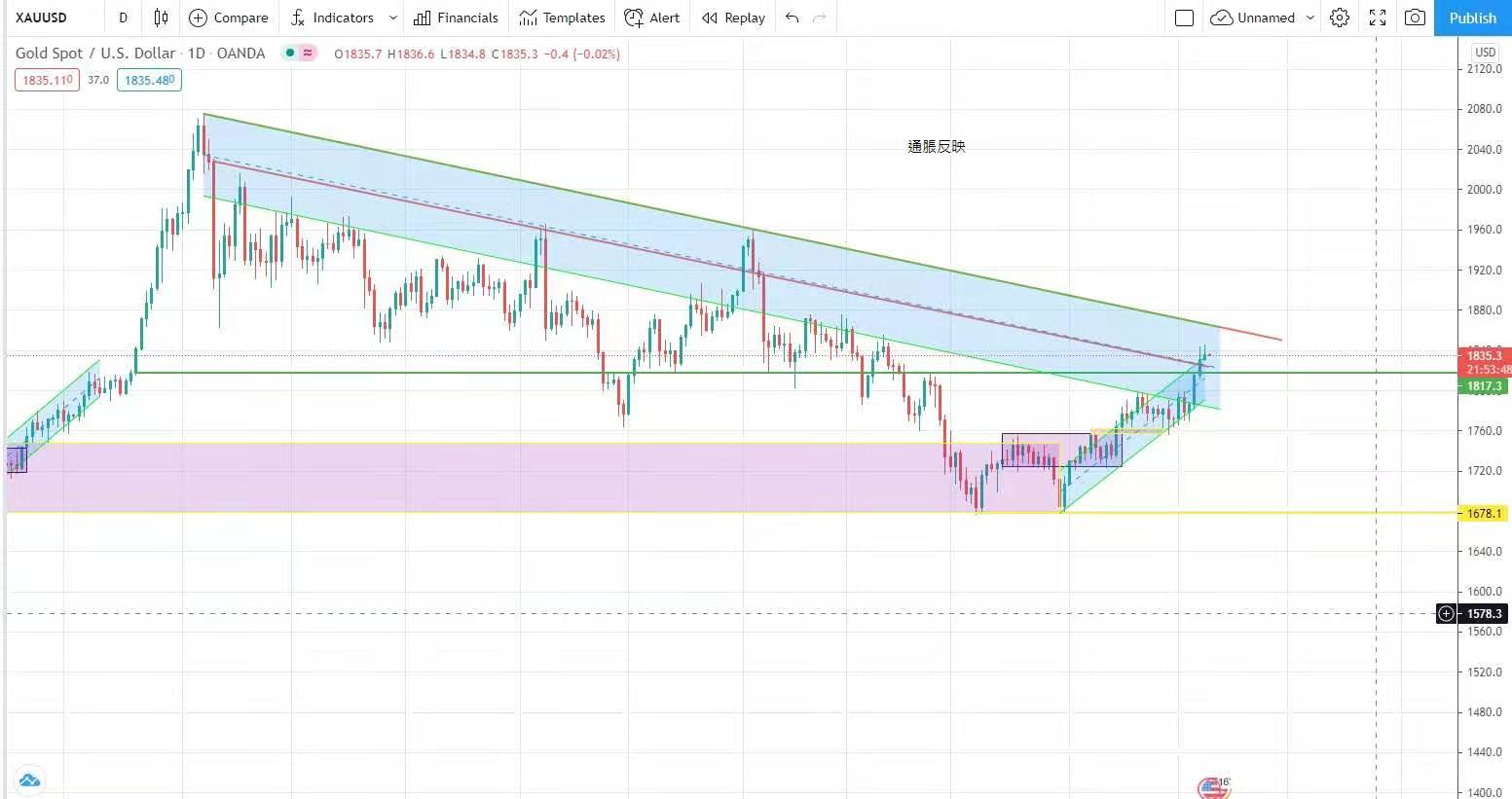 纳斯达克指数回升一日即转跌,损2.55%。预期通胀升温,金价昨日承接早前升势,连升四日,金价昨日高见1845美元,最低则见1830美元,