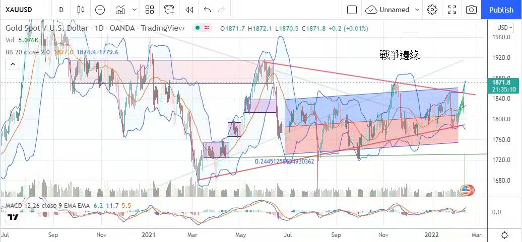 而美元指数亦回升至96点水平,纵使如此,在东欧进入战争边缘下,其他数据不值一提,金价在避险需求下照升不晤,金价昨日低位曾见1850.8美元,