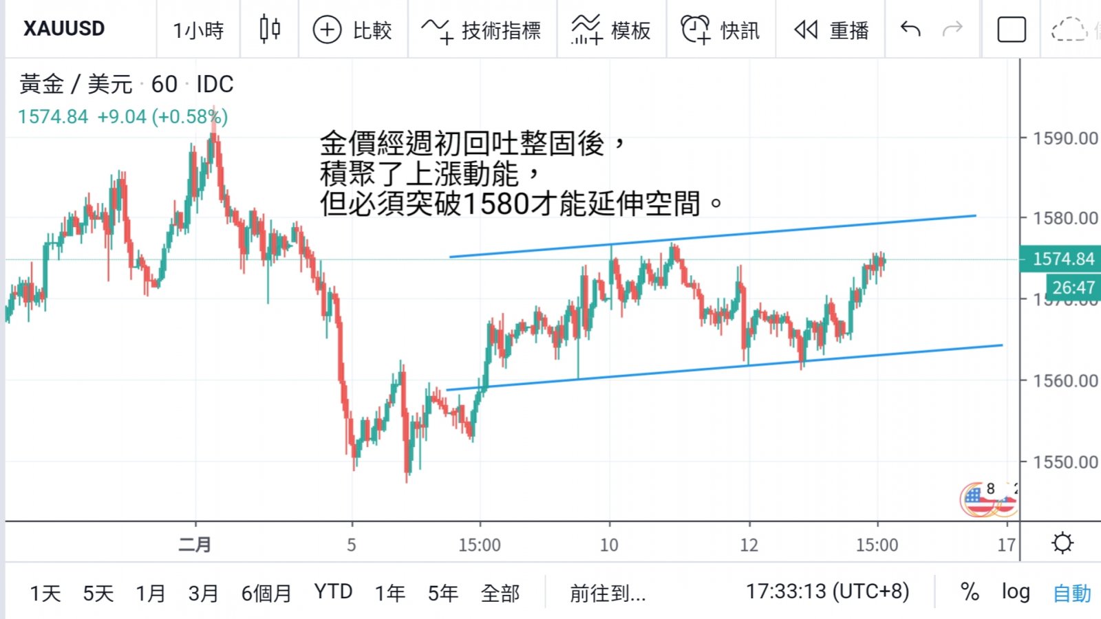 整固两天后,要视乎金价能否突破1580关口,若能上升则可延伸上升空间,否则金价的整固区间不变,但下方支持将逐步提升。