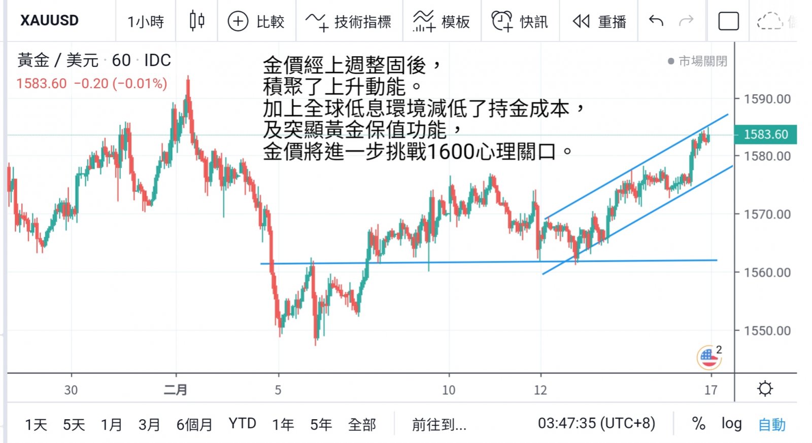 在全球低息环境下,持金成本相当轻微,中长线承托了黄金的走势,金价又再迫近1600关口,再向上突破,则有机会创近七年高位。
