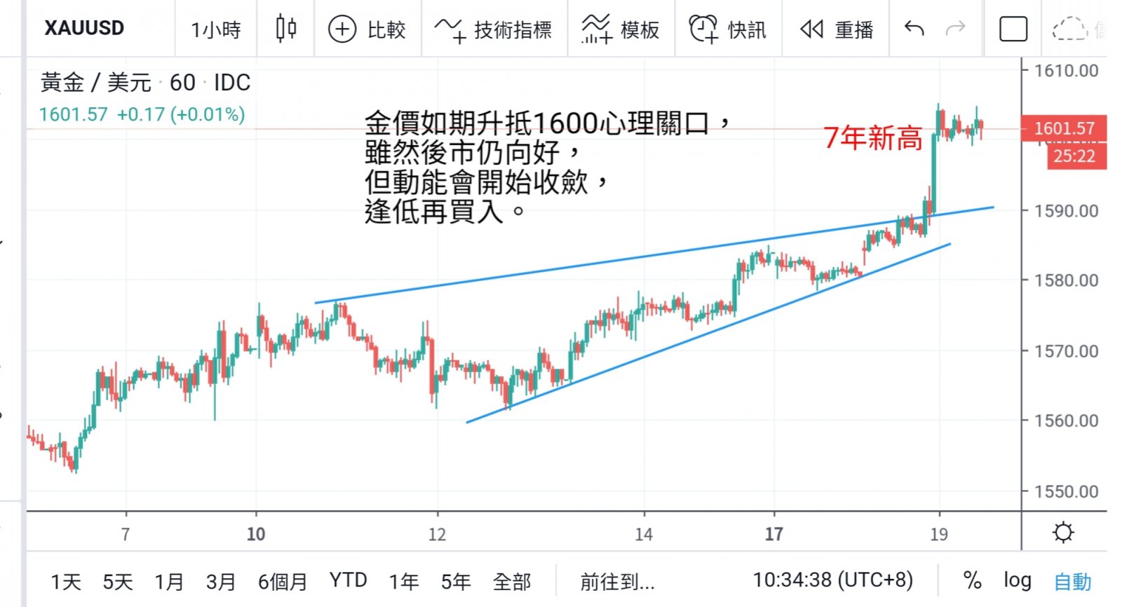 上月议息记录会给予投资者更多启示。金价保持上行,但由于已累积一定升幅,建议可先行部份获利,再逢低买进。