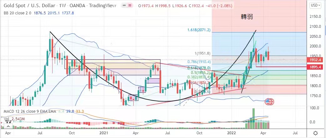 陡峭,對金價構成壓力,金價最低見1926.6美元,最後以 1932.4美元收市。總結一星期,金價跌41美元。