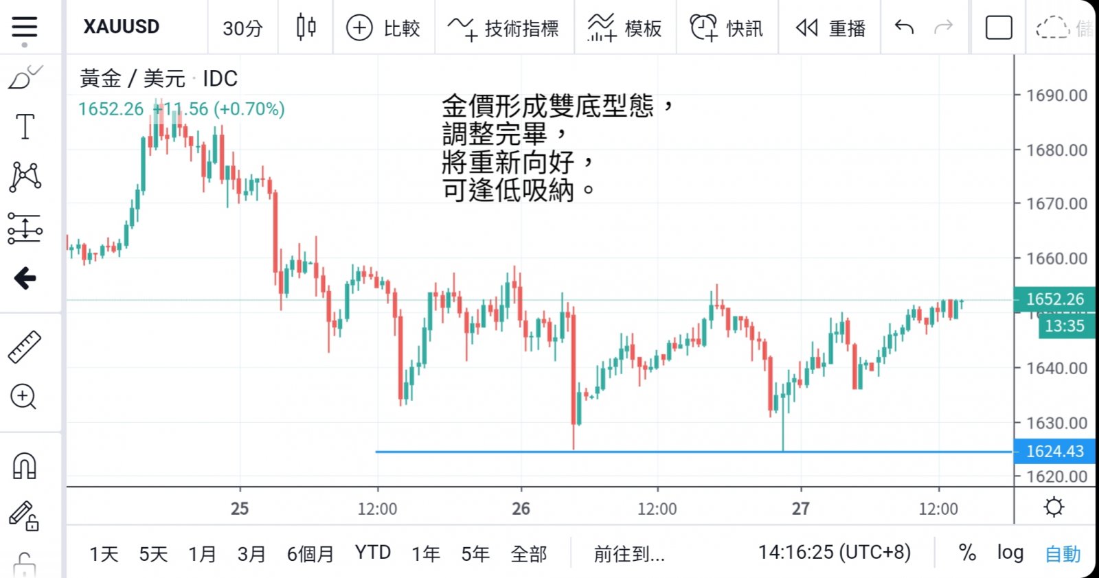 歐洲市中段一片樂觀預期下,扛壓金價回軟再回低位,又再重回1624美元,但沽壓無法進一步打壓金價,形成雙底型底後,